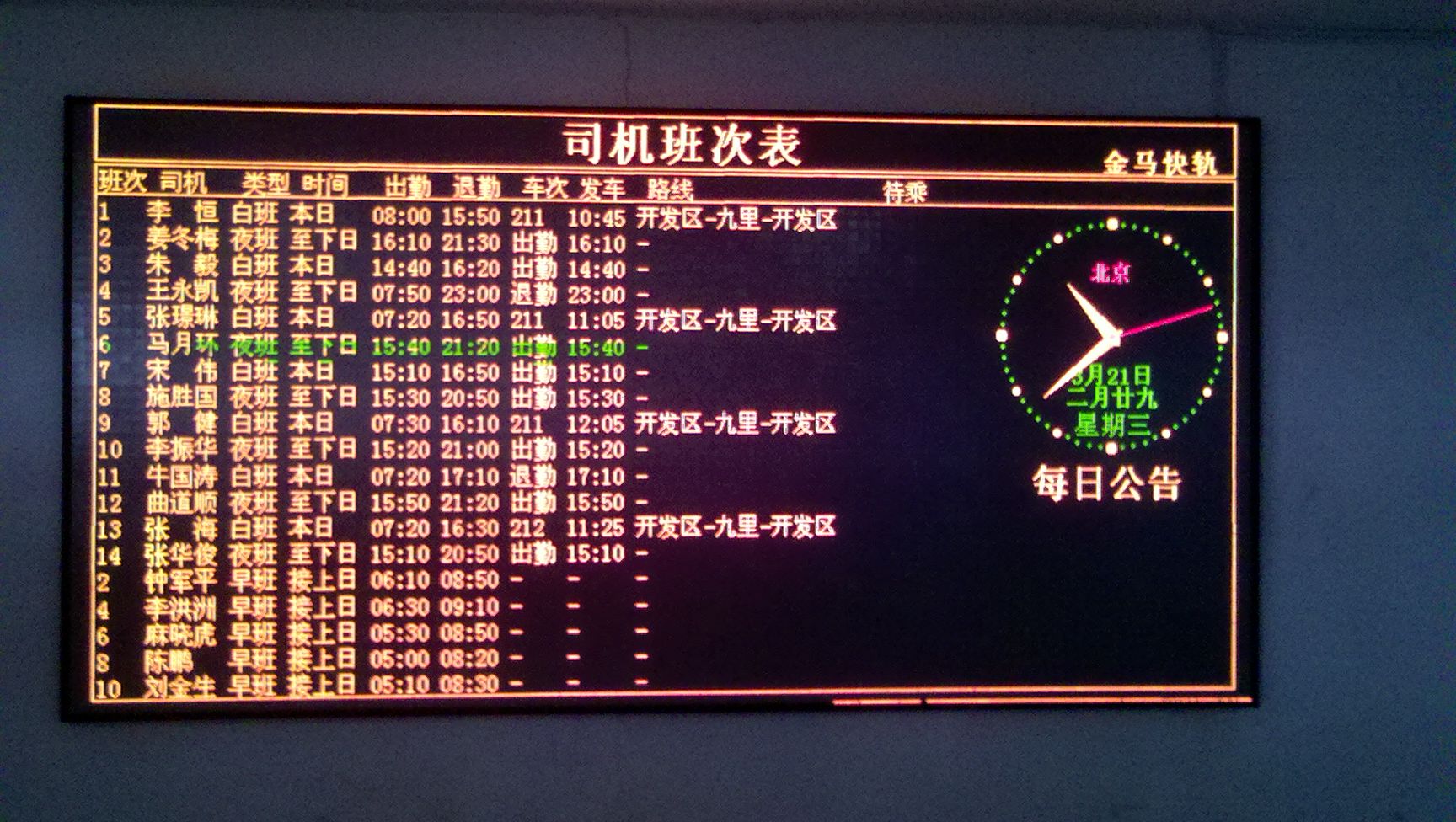大屏幕及查詢系統(tǒng)滿足地鐵列車運(yùn)營時(shí)刻表和司機(jī)相關(guān)作業(yè)規(guī)定的需要,動態(tài)掌握司機(jī)狀況,自動生成合理的司機(jī)出乘計(jì)劃,使派班管理員減少重復(fù)勞動,提高工作效率。同時(shí)避免人為因素出現(xiàn)的計(jì)劃編制差錯,實(shí)現(xiàn)對司機(jī)的科學(xué)、規(guī)范管理。